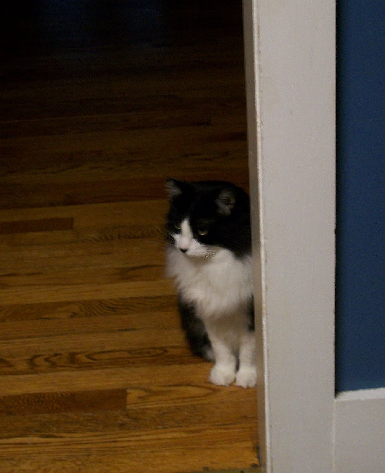 I noticed Squeak wasn't coming down to eat treats with the other cats. After a day or two of me tracking him down and laying a pile of Fancy Feast dry in front of his nose, he began eating again with gusto, and I figured all was well. I made sure Bear was out during the day, and even closed Bear up in the great room at night so Squeak could be comfortable hanging out by the fire.